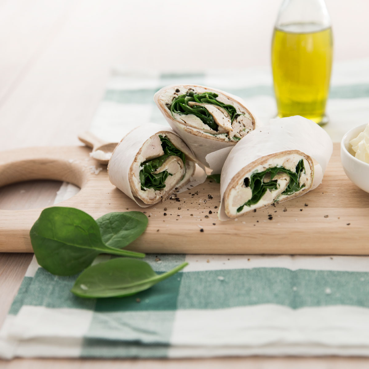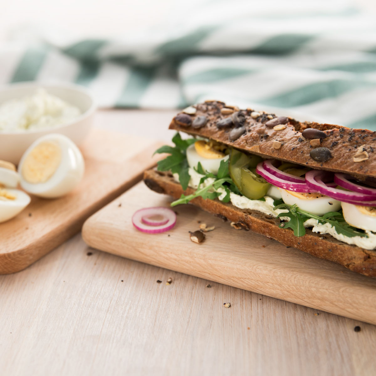 - Spread the cheese mix on a baguette slice and top with salad greens, slices of red pepper, grilled chicken and a slice of emmental